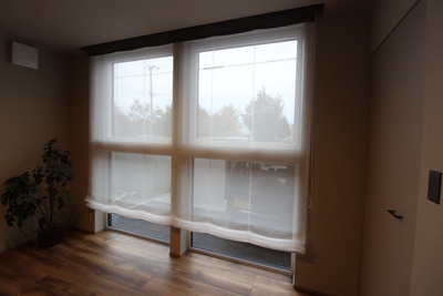 カーテンにも工夫していて、レース部分も上部に上がる「ダブルシェード」を選択しています。