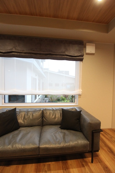 ソファーにワンちゃんが乗ったときに外を見れるように、ソファの背面の窓のカーテンも「ダブルシェード」にしています。