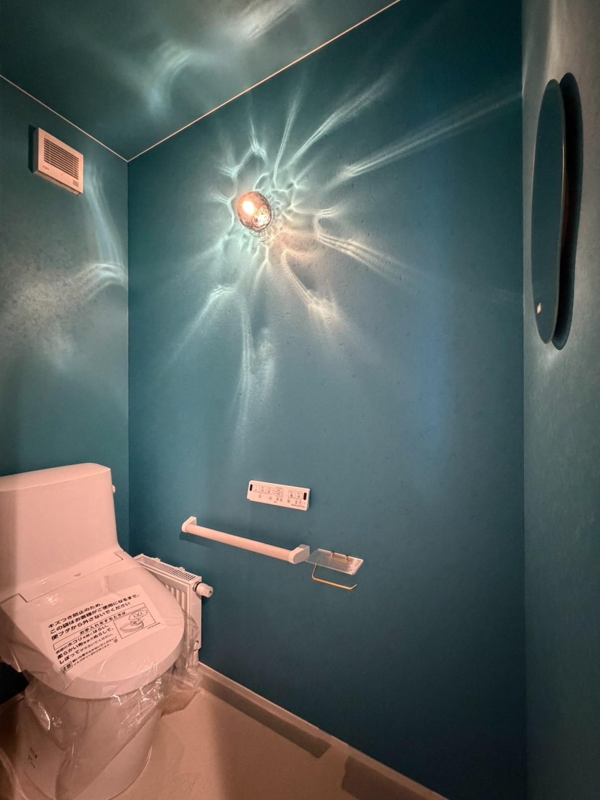 海をイメージした壁紙だけでなく、砂浜のキラキラを想像させるクッションフロア