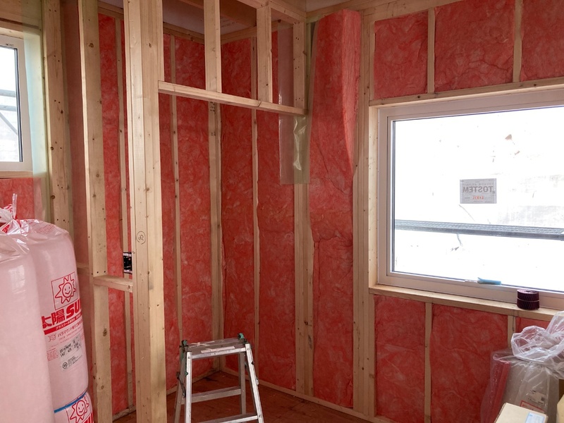 壁の断熱材充填作業が完了致しました。