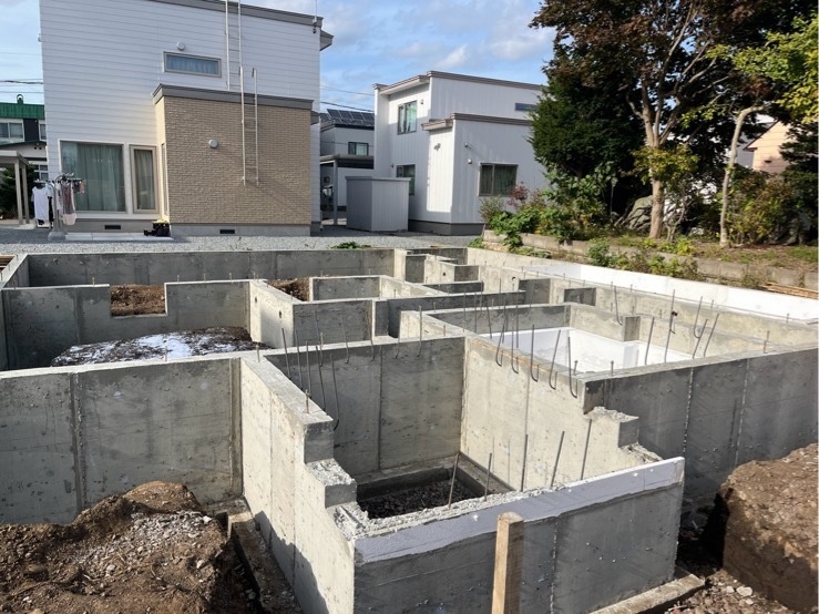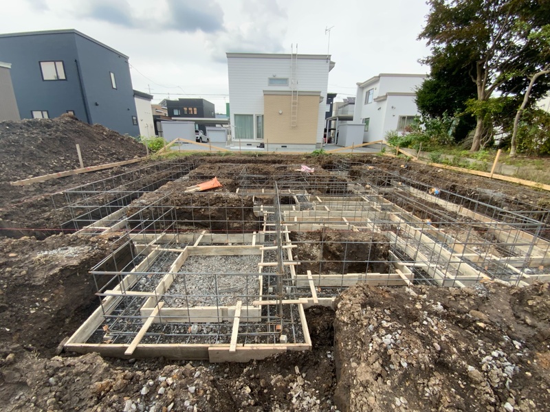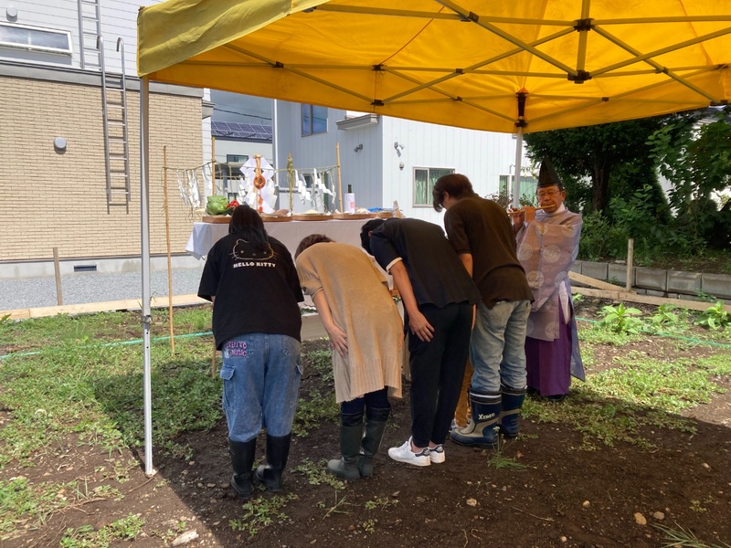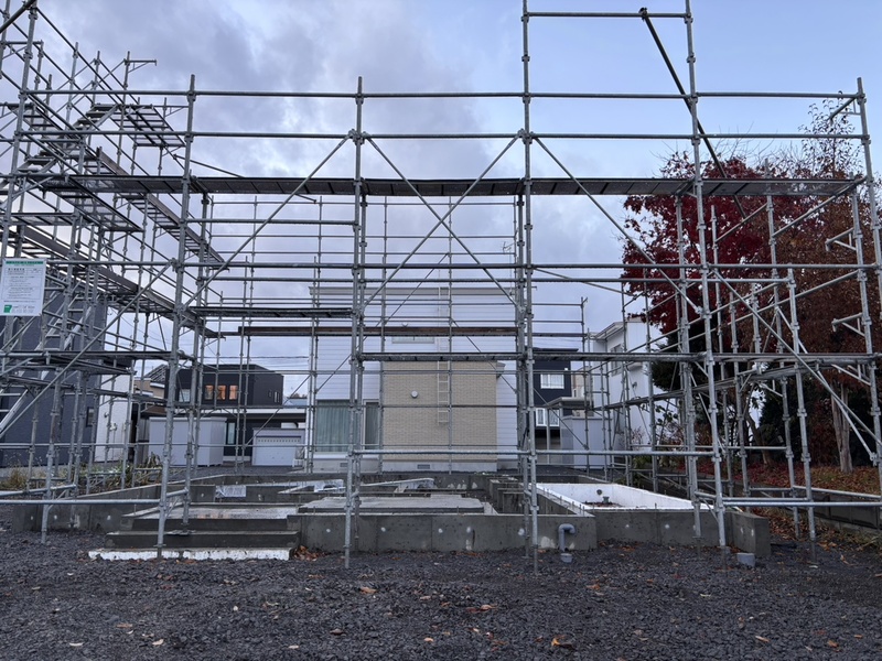 錦町H様邸 着工 基礎工事 やり方を確認しました。 2025.8.23 地鎮祭 地鎮祭をやりました。 2025.8.23 基礎工事 配筋を組みました。 2025.10.3 基礎工事 脱枠をしました。 2025.10.9 仮設工事 足場をが組み立てました。 2025.11.7