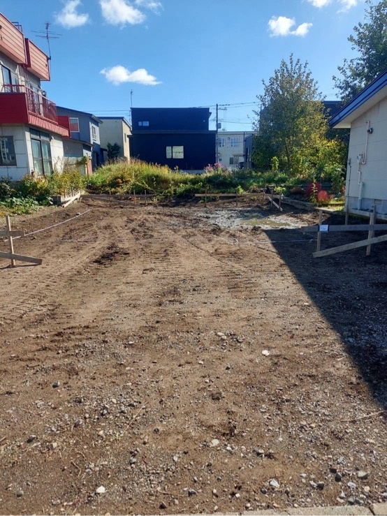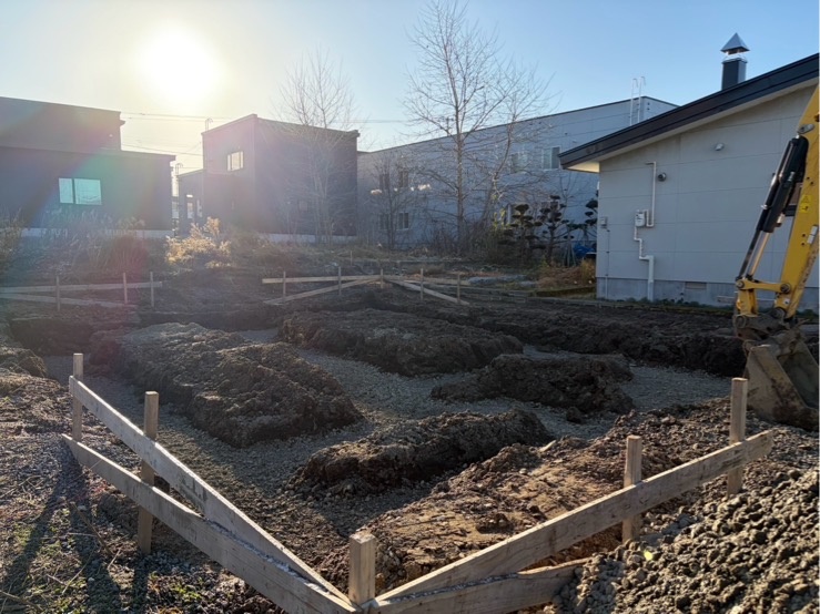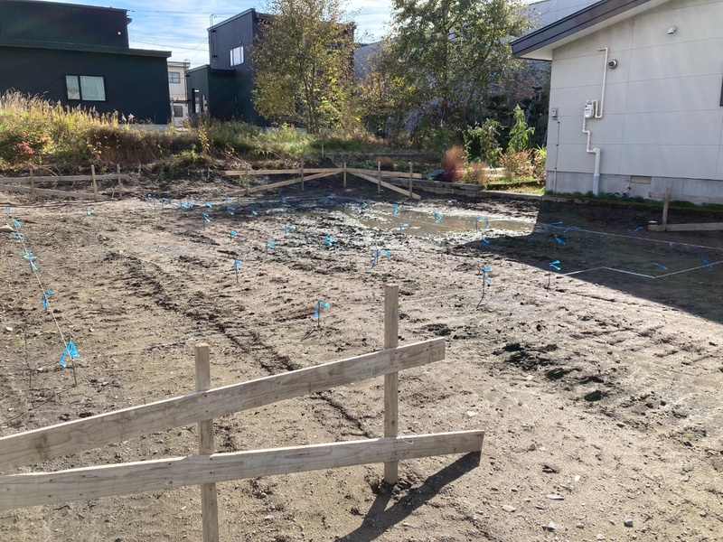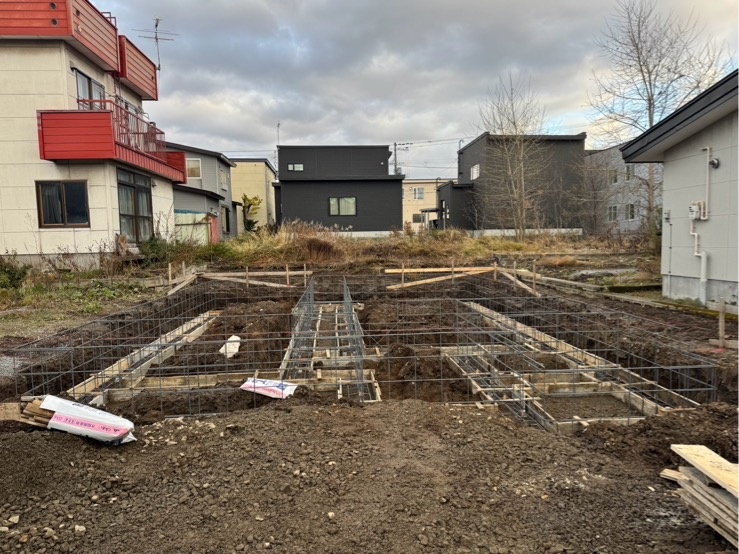 東 H様邸 着工 仮設工事 やり方を設置しました。 2025.10.9 墨出し工事 杭芯を出しました。 2025.10.25 基礎工事 掘削工事を行いました。 2025.11.8 基礎工事 鉄筋が組みあがりました。 2025.11.11