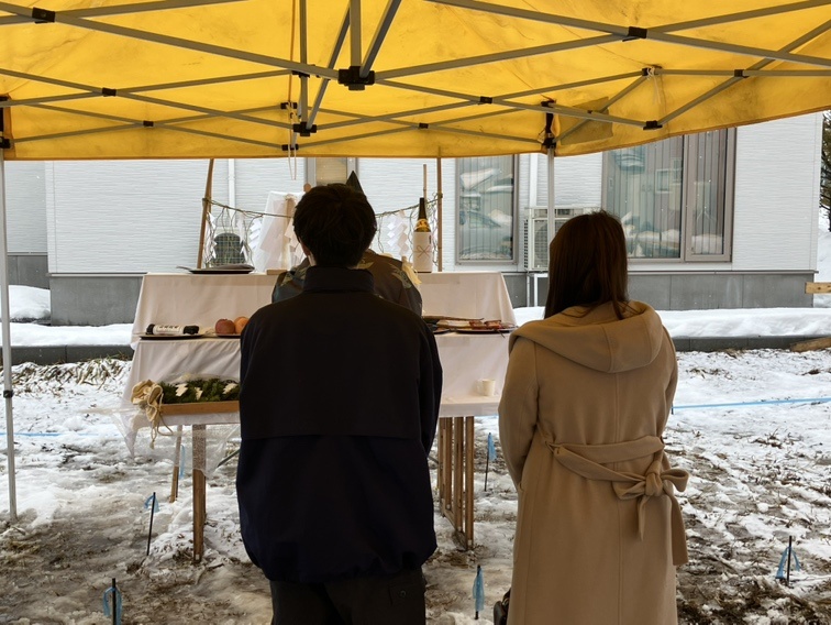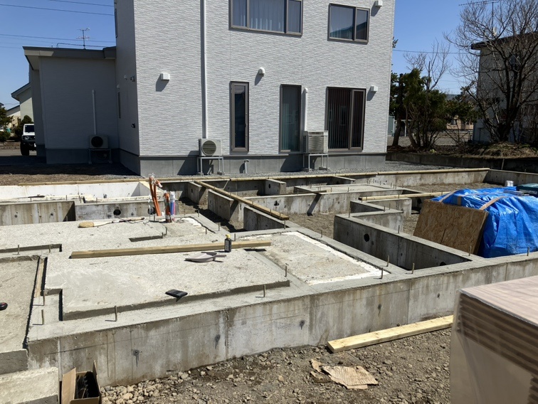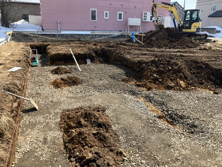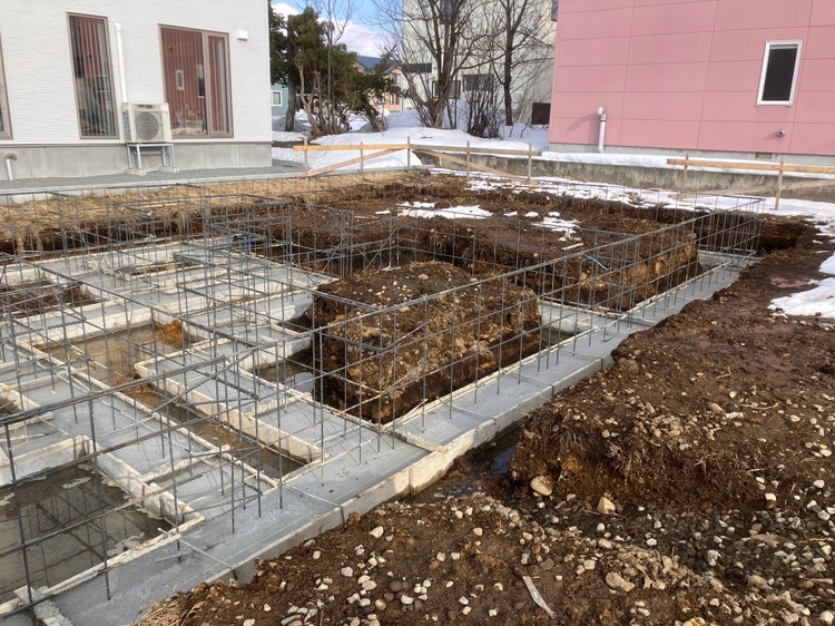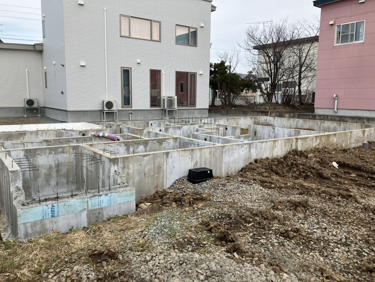 美瑛N様邸 着工 基礎工事 遣り方を出しました。 2026.2.26 地鎮祭 地鎮祭を行いました。 2026.2.28 基礎工事 根掘りを行っております。 2026.3.20 基礎工事 ベースコンクリートを打設しました。 2026.3.24 基礎工事 型枠を組んでいます。 2026.3.31 基礎工事 脱枠をしました。 2026.4.9 木工事 基礎が完成し、土台敷きを しています。 2026.4.16
