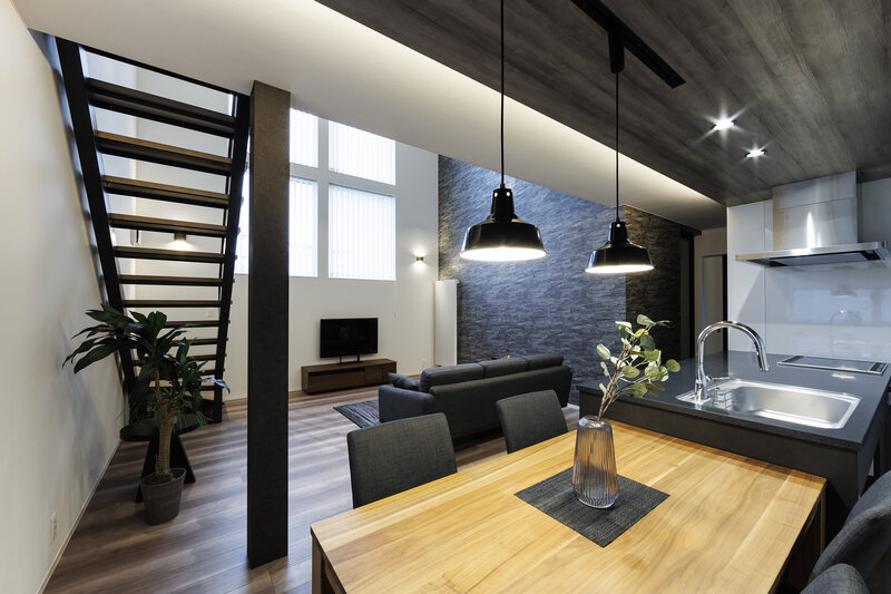 スケルトン階段とルーバーが、抜け感とデザインの美しさを演出します。